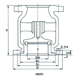 H42H、H42W立式止回閥正常處于關(guān)閉狀態(tài),由于管線中進(jìn)口端介質(zhì)的壓力作用,而克服彈簧阻力使閥門開(kāi)啟。當(dāng)進(jìn)口端介質(zhì)壓力低于出口端時(shí),彈簧將閥芯推向閥座而使閥門關(guān)閉,阻止介質(zhì)逆流,故起止回作用。